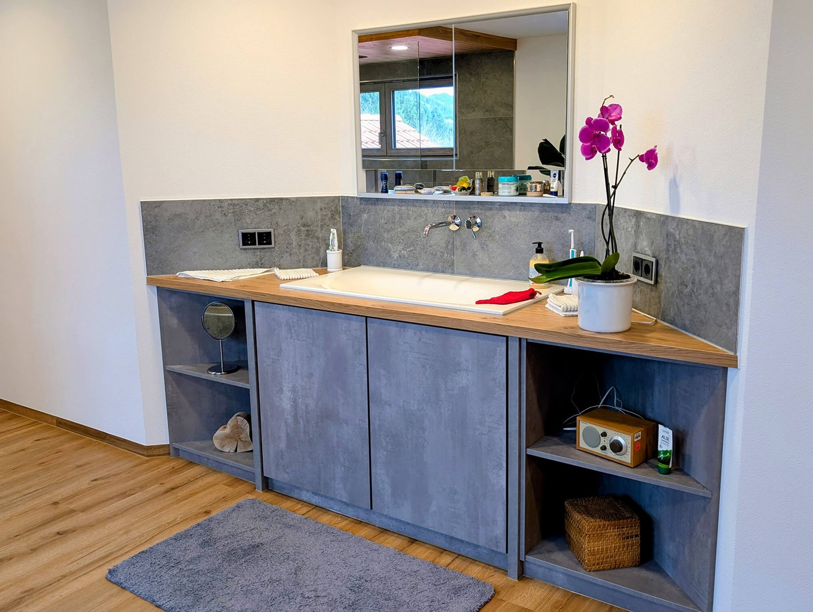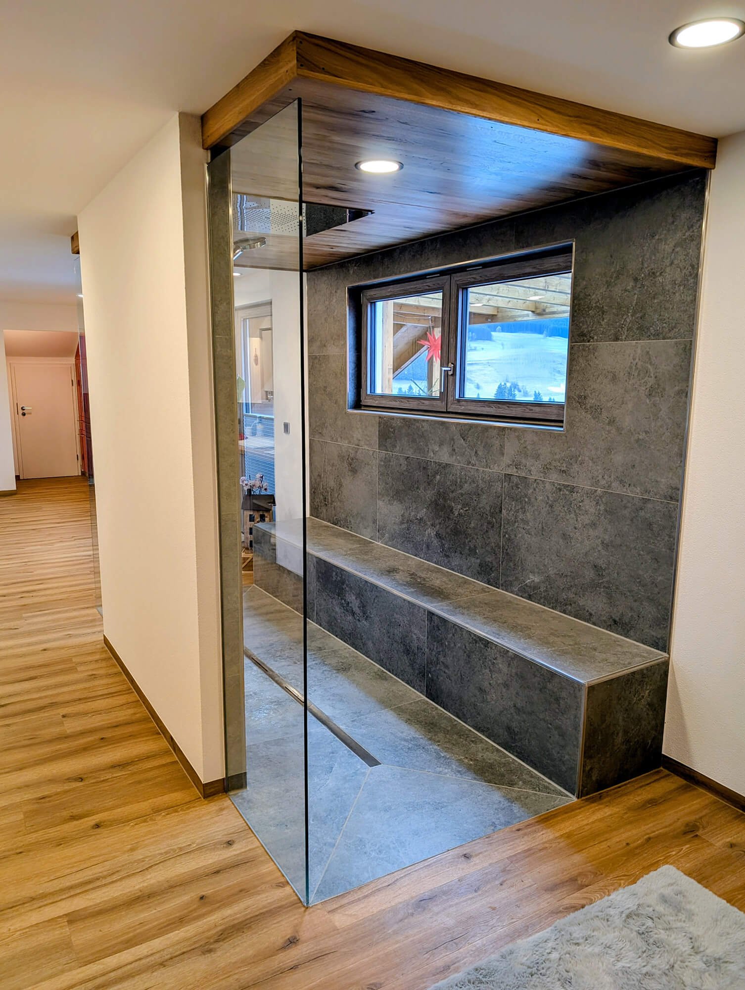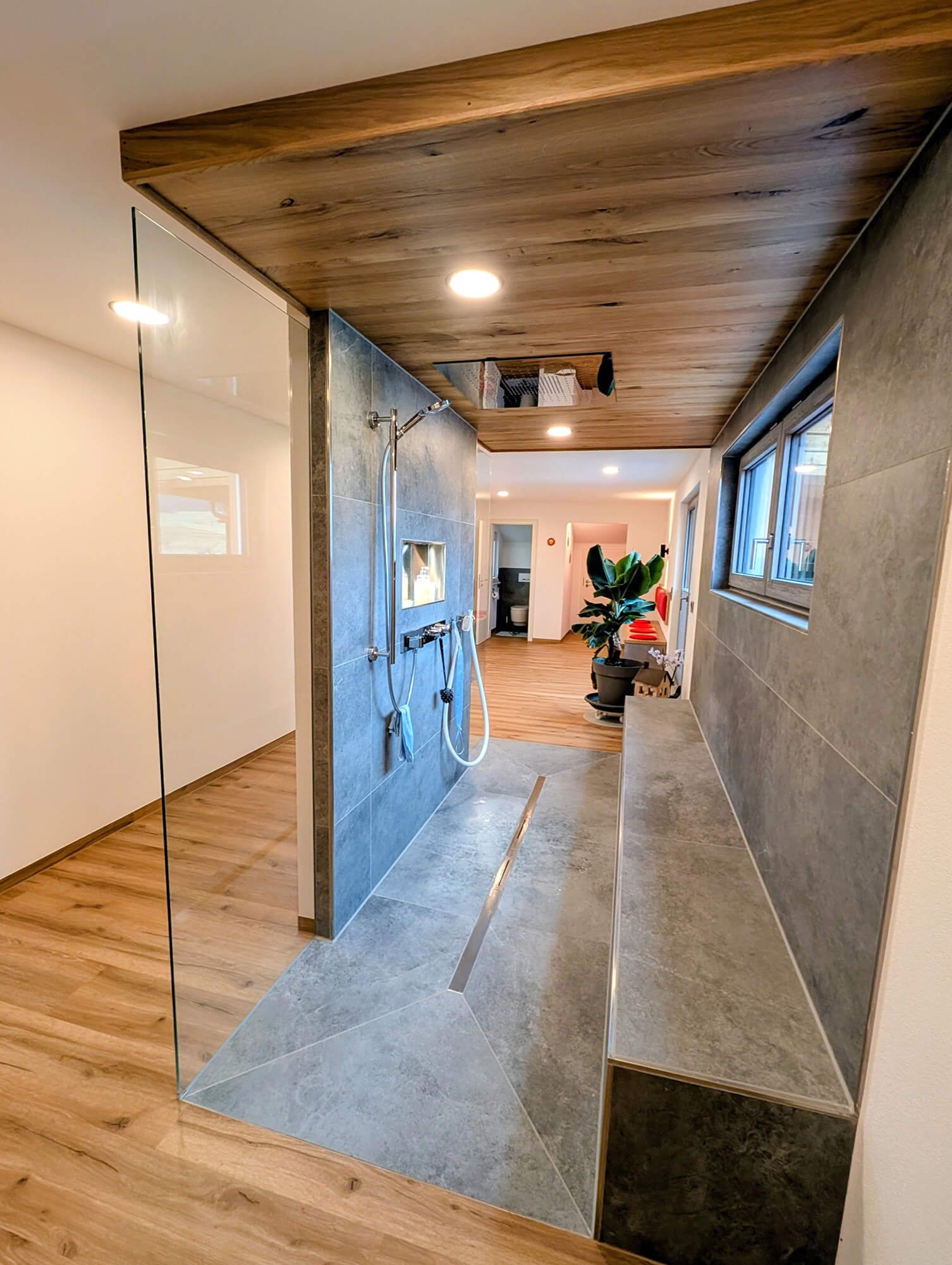 Großzügig, lichtdurchflutet und klar strukturiert – im Rahmen dieses Badumbaus in Weitnau entstand aus einem ehemals engen und verwinkelten Raum eine moderne Wohlfühloase. Ziel der Badsanierung war es, Offenheit zu schaffen und die vorhandene Sauna harmonisch in das neue Raumkonzept zu integrieren. Eine begehbare Dusche, von zwei Seiten zugänglich, bildet heute das Herzstück des Badezimmers. Für deutlich mehr Tageslicht sorgt ein neu eingebautes doppelflügeliges Fenster im Duschbereich. Planung, Baustellenleitung, Koordination aller Gewerke sowie die komplette Ausführung lagen dabei in unserer Hand – für einen reibungslosen Ablauf und höchste Qualität bis ins Detail.