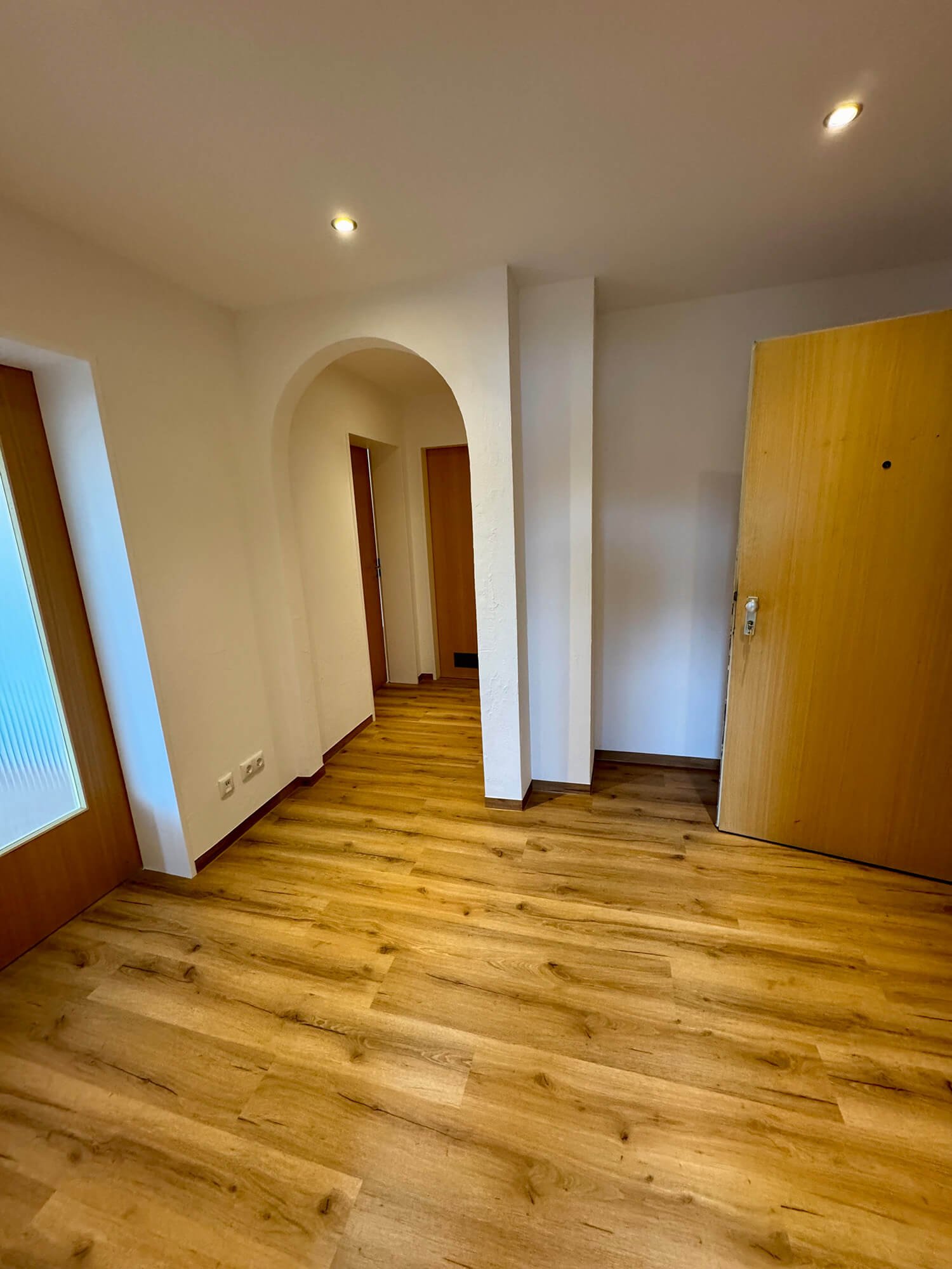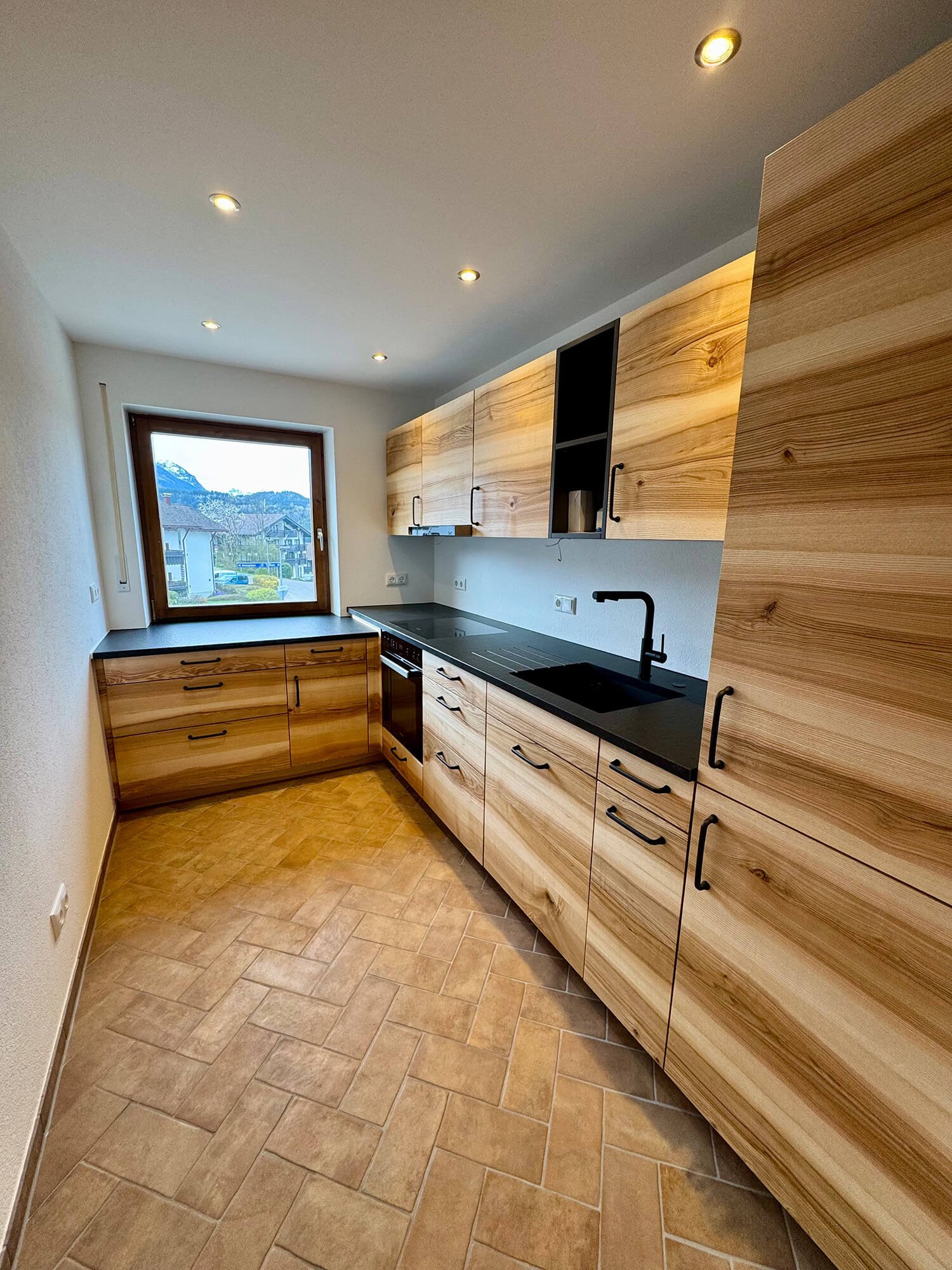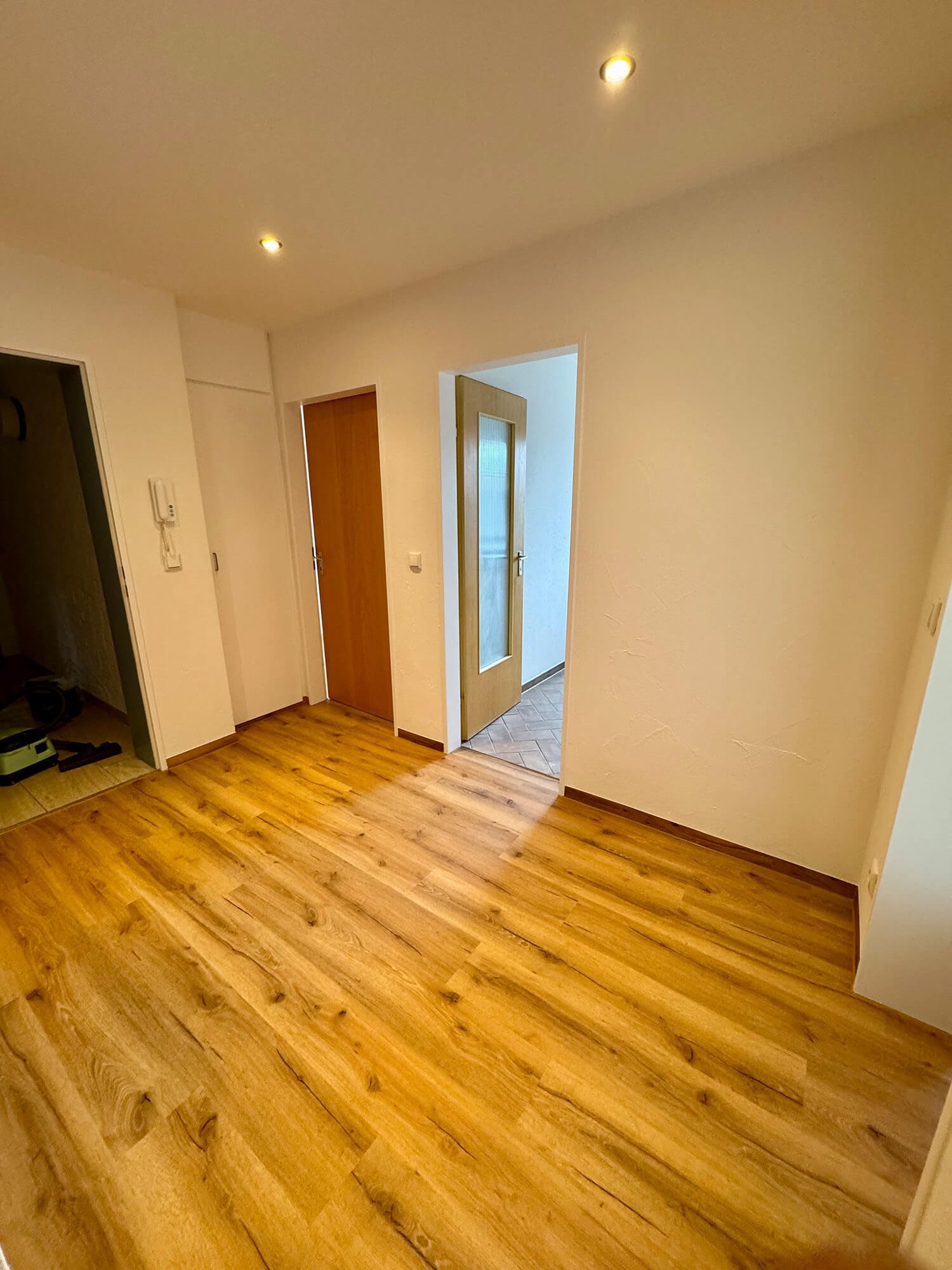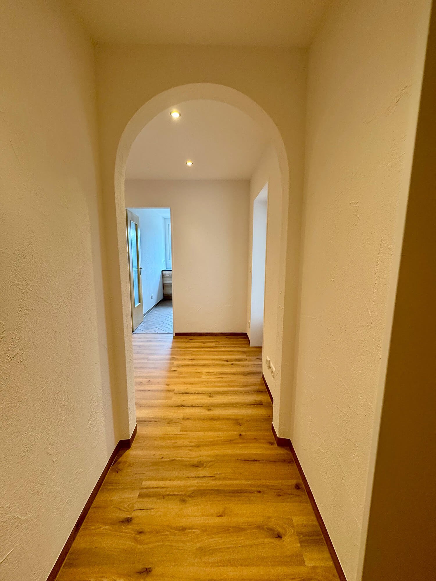 Bei diesem Bauvorhaben übernahmen wir eine umfassende Wohnraumsanierung mit besonderem Fokus auf Koordination und handwerkliche Umsetzung. Neben der vollständigen Organisation der Fremdgewerke – vom Elektriker bis zum Küchenbauer – wurden die Wände und Decken in traditioneller Kellenschlagtechnik verputzt und gestrichen. Für eine moderne Lichtlösung erhielten Küche und Flur eine abgehängte Decke mit Einbaustrahlern. Auch beim Boden wurde viel Wert auf Funktion und Ausgleich unterschiedlicher Raumhöhen gelegt. Als Blickfang wurde die Küchenfläche in klassischem Fischgrätmuster gefliest – ergänzt durch unbesäumte Eichen-Fensterbänke, die natürliche Akzente setzen.