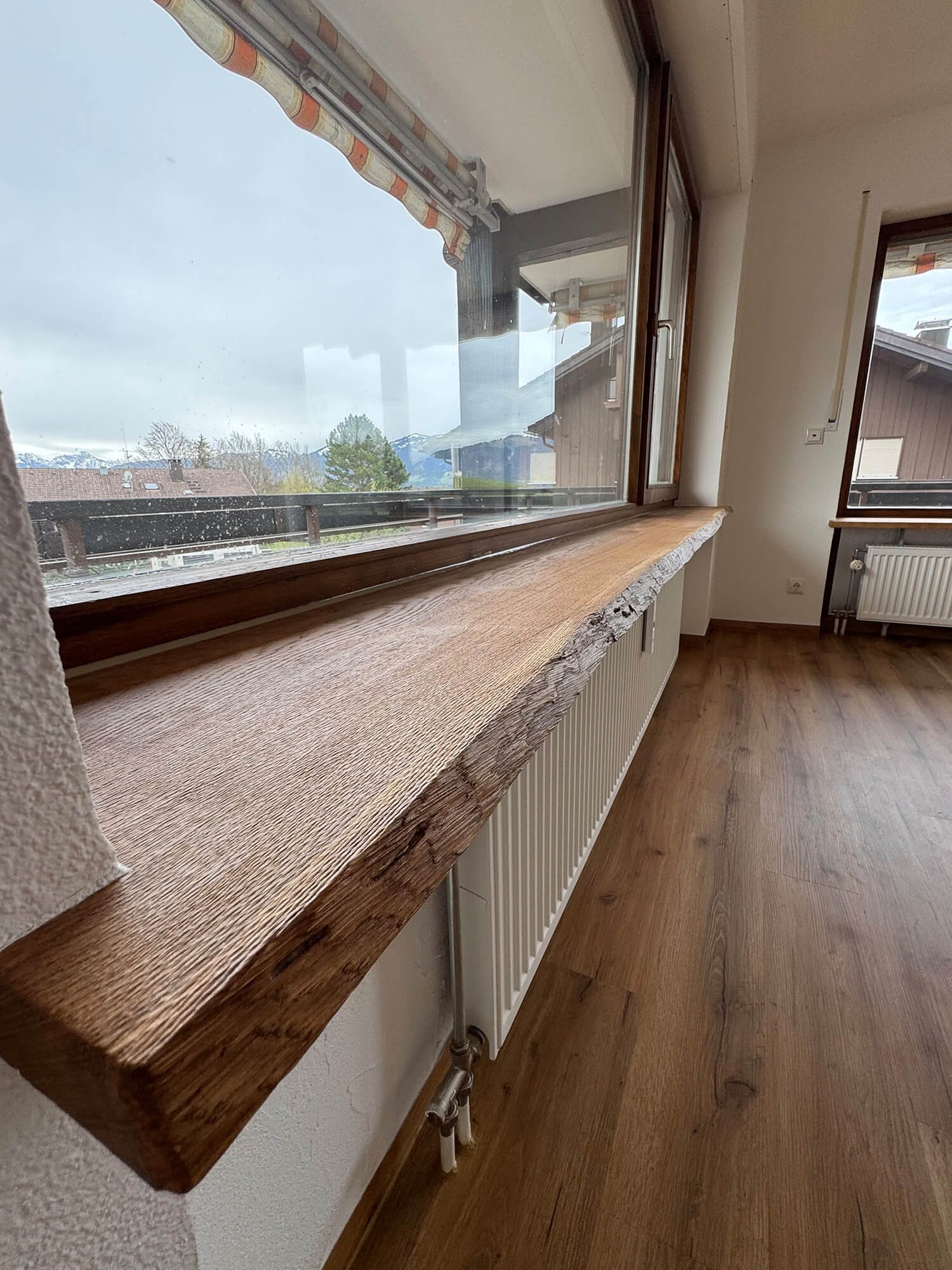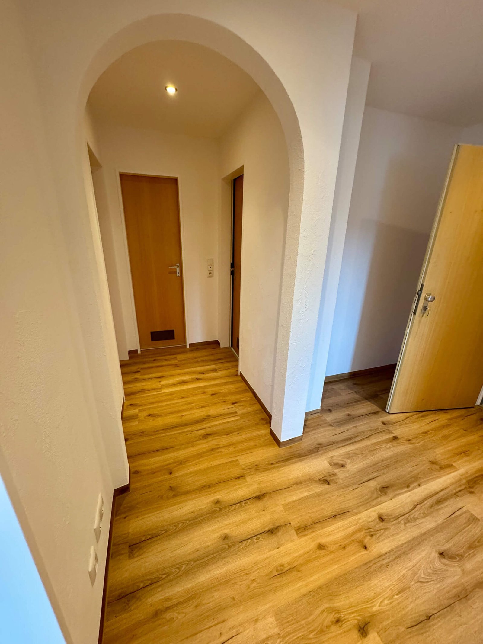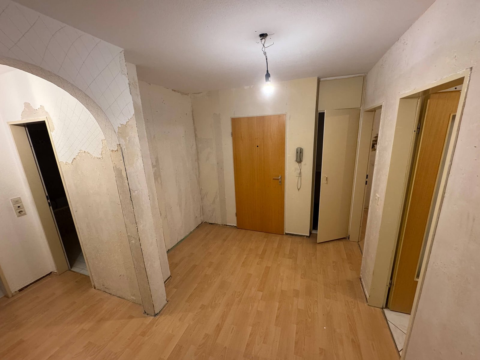 Bei diesem Bauvorhaben übernahmen wir eine umfassende Wohnraumsanierung mit besonderem Fokus auf Koordination und handwerkliche Umsetzung. Neben der vollständigen Organisation der Fremdgewerke – vom Elektriker bis zum Küchenbauer – wurden die Wände und Decken in traditioneller Kellenschlagtechnik verputzt und gestrichen. Für eine moderne Lichtlösung erhielten Küche und Flur eine abgehängte Decke mit Einbaustrahlern. Auch beim Boden wurde viel Wert auf Funktion und Ausgleich unterschiedlicher Raumhöhen gelegt. Als Blickfang wurde die Küchenfläche in klassischem Fischgrätmuster gefliest – ergänzt durch unbesäumte Eichen-Fensterbänke, die natürliche Akzente setzen.